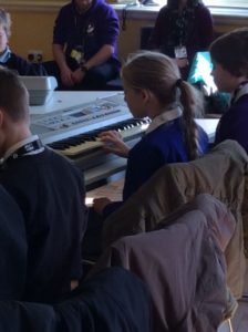 After a warm-up, involving clapping and singing games that really made us listen and think, the workshops started. Most of our children took part in the vocal workshop but Niamh in Y6 has piano lessons, so she went off to the keyboard workshop and Dominic plays the guitar, so he took part in that separate workshop. Kadence and Meisha went to the drumming workshop together.